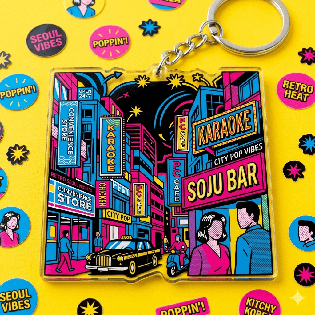 밤의 도시 풍경을 담은 시티팝 키링입니다. 네온사인 가득한 거리가 레트로 감성을 불러일으킵니다. 강렬한 핑크, 블루, 옐로우 색상의 조화가 시선을 사로잡습니다. 세련된 라인과 디테일이 돋보이는 디자인입니다. 가방이나 파우치에 포인트를 주거나, 열쇠에 달아 사용하기 좋습니다. 친구와 커플 아이템으로도 특별한 선물이 될 것입니다. 투명 아크릴에 선명하게 인쇄되어 색감이 오래도록 유지됩니다. 일상에 활력을 더하는 유니크한 액세서리입니다. 키링의 크기는 어떻게 되나요? 약 7cm x 7cm로 가방이나 파우치에 달기 좋은 사이즈입니다.