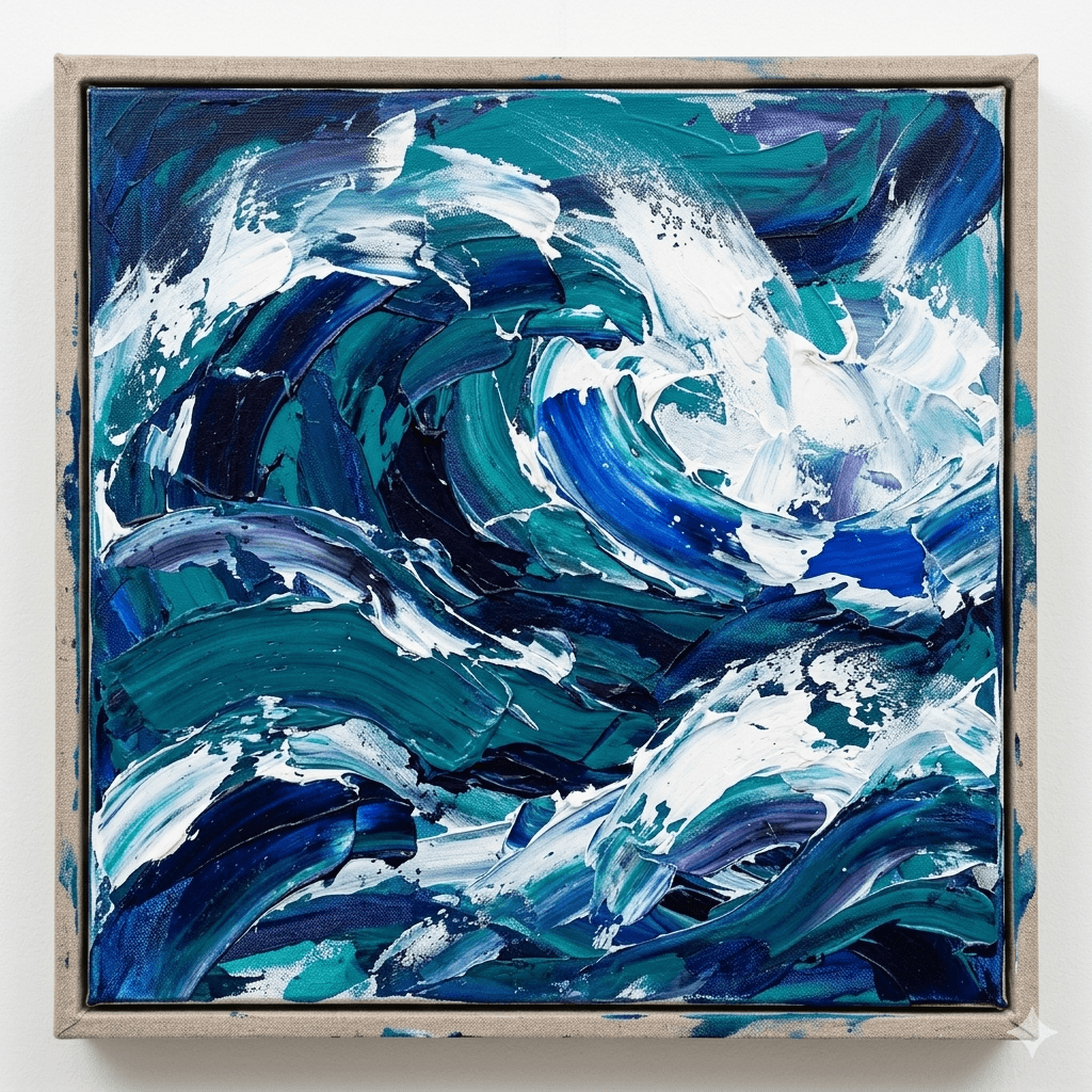 제 작품 <오션>은 제가 정말 좋아하는 부산 바다에서 영감을 받아 만들었습니다. 그 넓은 수평선과 힘차게 파도가 치는 모습을 수백 번도 넘게 보면서, 그 느낌을 그대로 캔버스에 담고 싶었어요. 특히 파도가 부서질 때 하얗게 일어나는 포말과, 바다 깊은 곳의 그 깊고 푸른 색이 참 매력적이었거든요. 그 시원하고 역동적인 느낌을 살리고 싶어서, 붓으로 부드럽게 칠하는 대신 손가락 끝에 물감을 묻혀서 직접 꾹꾹 발라가며 작업했습니다. 그렇게 물감을 아주 두툼하게 여러 번 쌓아서, 단순히 색을 칠하는 게 아니라, 제가 바다 앞에서 느꼈던 시원한 바람과 힘찬 파도의 에너지를 캔버스 위에 직접 쌓아 올린다는 느낌으로 만들었어요. 제 기억 속의 그 바다가 캔버스 위에 생생하게 남아있기를 바라는 마음으로요.